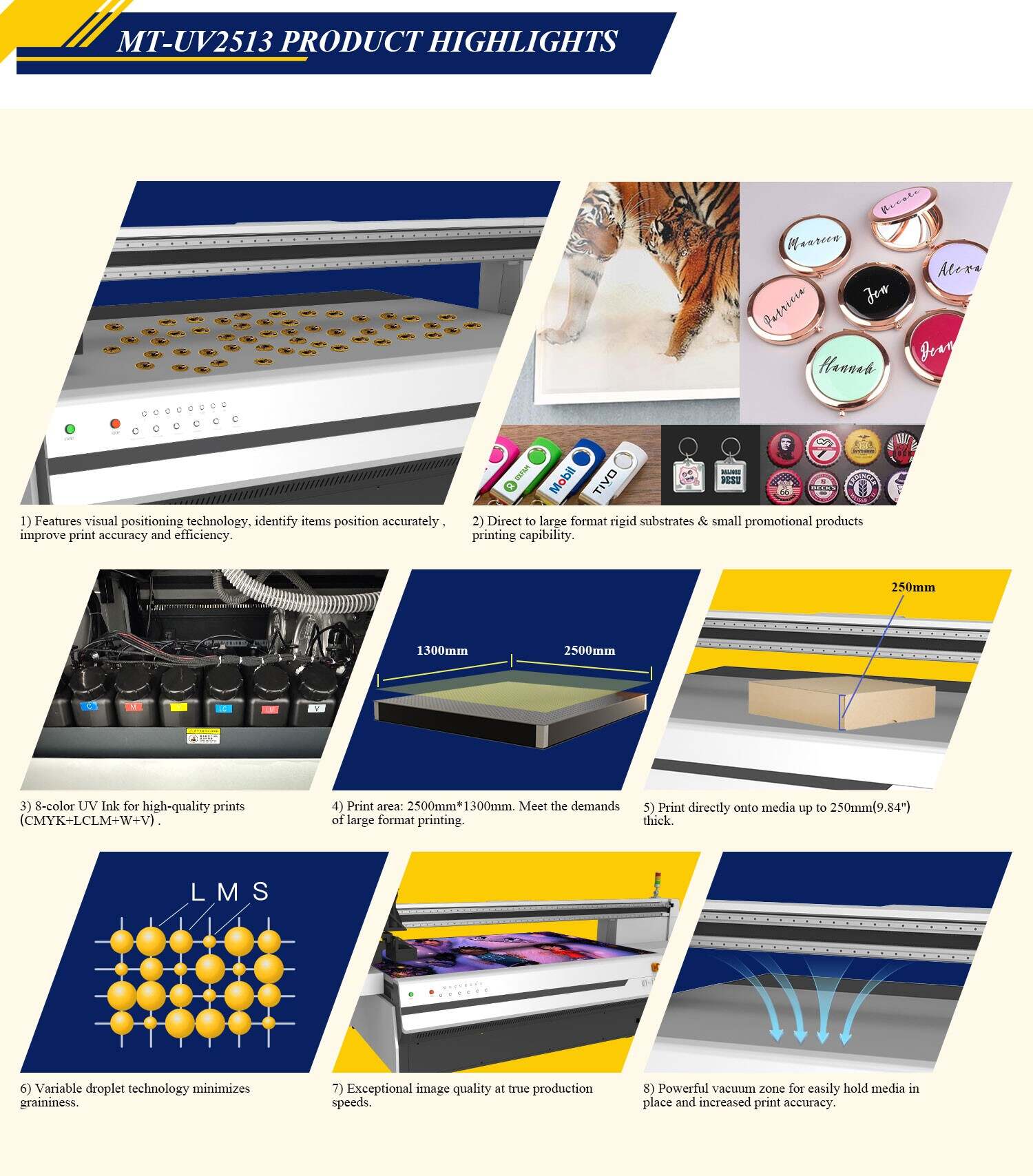|  | Professional manufacturer to provide perfect pre-sale and after-sale service system MT-UV 2513GX UV flatbed printer is the core product of the MT brand, which has built a reputation for quality print machines over a 16-year history. With a record of providing quality, robust and reliable machines coupled with excellent customer service, covering everything from fast, efficient delivery to superb after-sale support for the lifetime of your purchase, you can have confidence in the MT-UV 2513GX as a printer and the whole ownership experience.