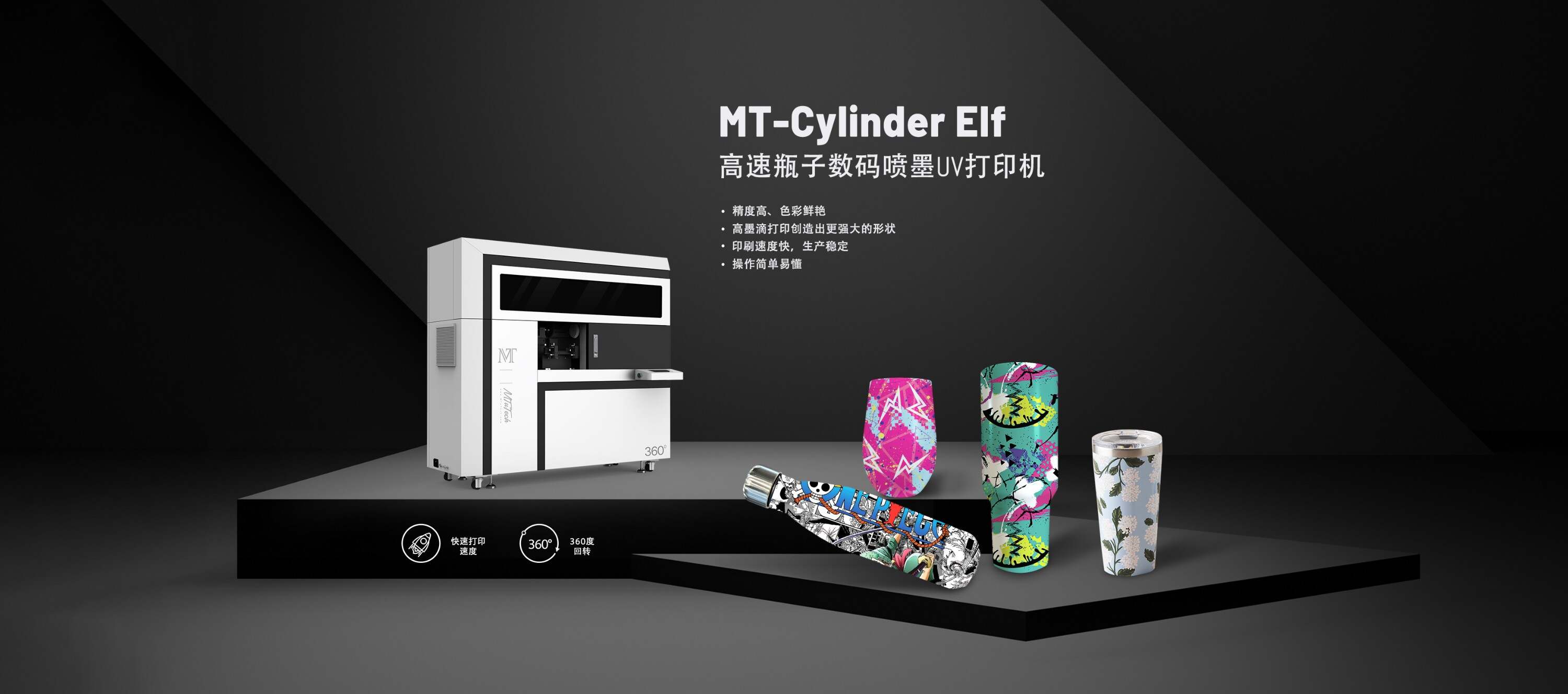 我们最新推出的MT-Cylinder Elf是一款定制的高速360旋转UV打印机,能够打印各种饮具,如水杯、真空保温瓶、玻璃器皿和杯子。它专为直接打印圆柱形表面以及不规则的锥形/圆锥形物体而设计。与传统的UV瓶子打印机不同,它具有快速打印能力、5D浮雕打印效果、高滴量打印,适用于打印锥形和圆锥形饮具,并且能够对各种瓶子对象进行360º无缝包裹打印。